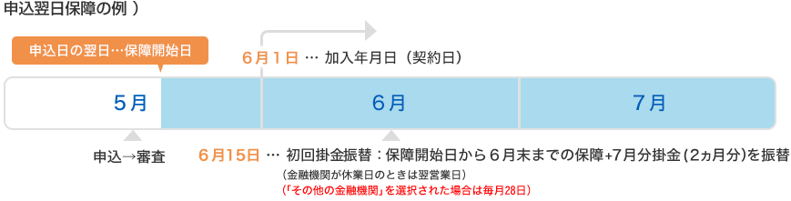 - お申し込み手続き時において、お申し込み日の翌日からの保障(「申込翌日保障」)を選択された場合は、初回のみ保障開始日から翌々月末日までの掛金(月掛金2ヵ月分)を振替させていただきます。